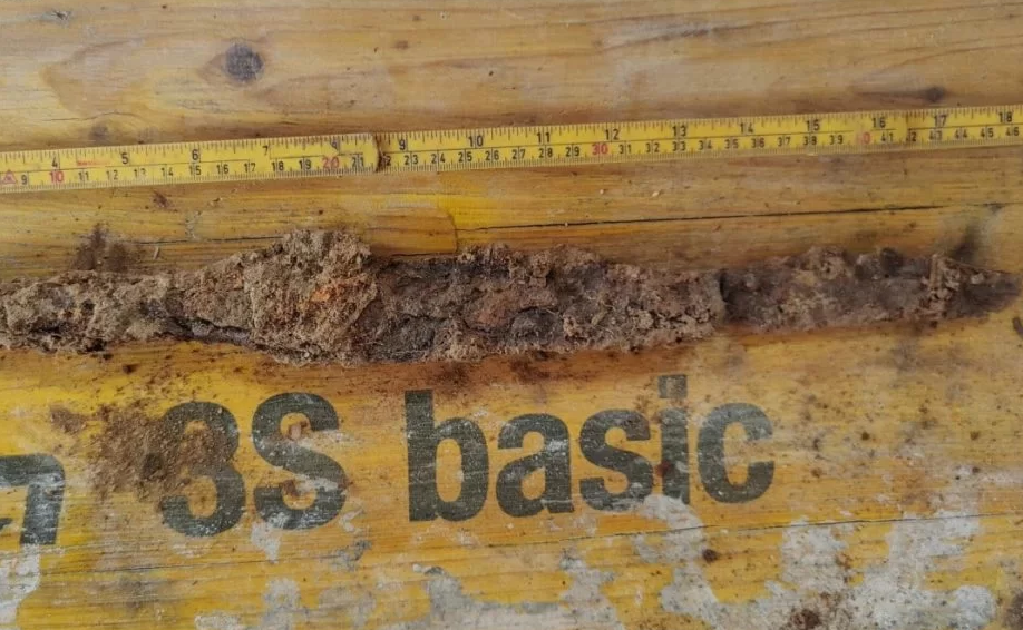 Местные археологи прибыли на место раскопок. Две части меча, которые были найдены, свидетельствуют о том, что он был длиной 70 см, а лезвие в самом широком месте составляло 5 см.
