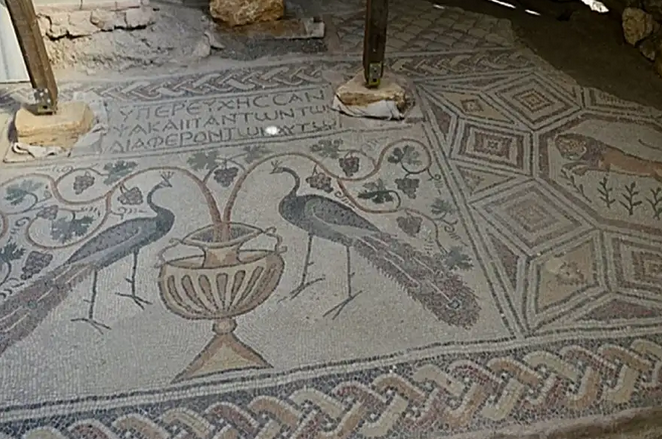 Мозаики расположены в разных частях квадратного строения. На них изображены фигуры птиц, амфор, украшения из виноградных корзин.
