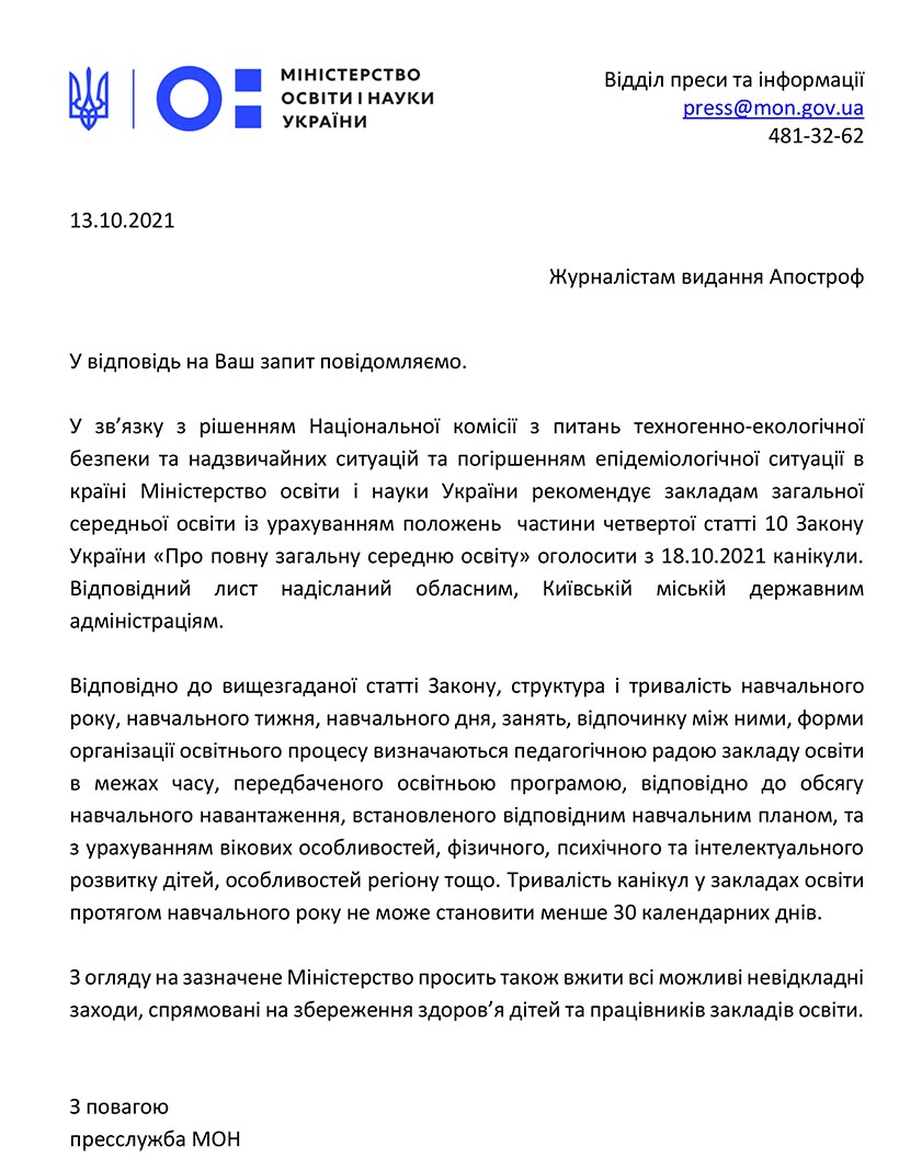 "Министерство образования и науки Украины рекомендует учреждениям общего среднего образования объявить с 18.10.2021 каникулы. Соответствующее письмо было отправлено областным, Киевской городской государственным администрациям", - говорится в тексте ответа.