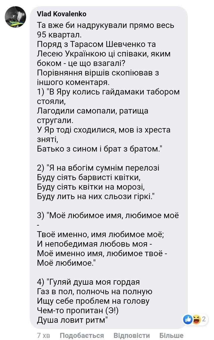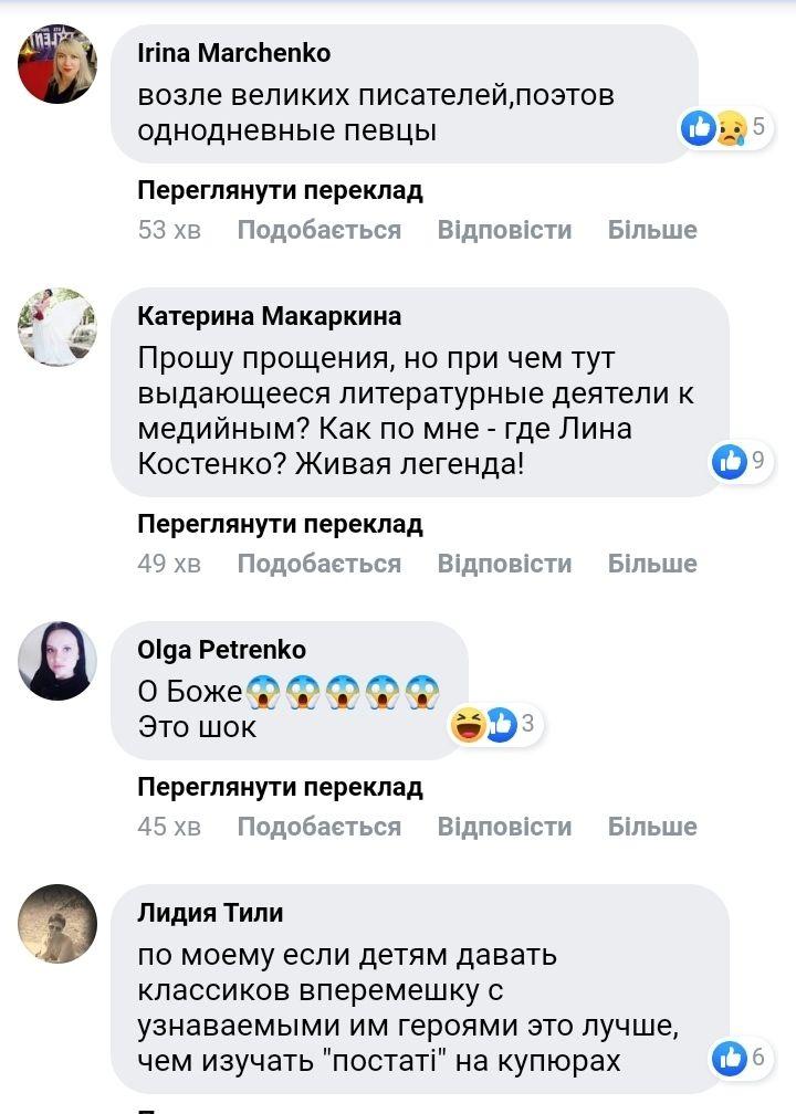 "Возле великих писателей, поэтов, однодневные певцы", "О Боже... Это шок", "Прошу прощения, но при чем тут выдающееся литературные деятели к медийным? Как по мне - где Лина Костенко? Живая легенда!", - пишут они.