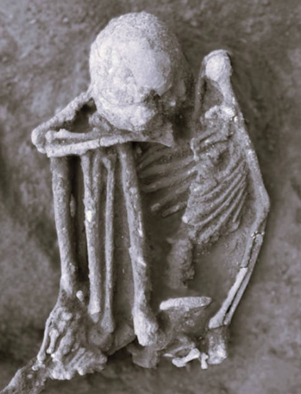 Однако впоследствии ученые заметили, что некоторые скелеты были расположены таким образом, что это противоречило анатомическому положению, некоторые кости в этих телах были частично обгоревшими. Признаки горения и обугливания были заметны преимущественно в тех частях тела, где мышечная масса была меньше, а мягкие ткани более тонкими.