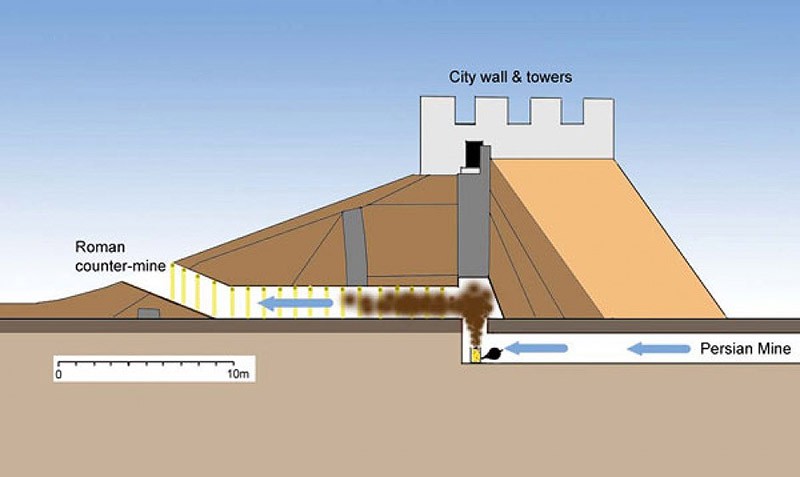 В 1933 году археолог Робер ду Меснил ду Бьюссон проводил раскопки под остатками древнего римско-персидского поля боя, когда наткнулся на какие-то осадные туннели, прорытые под городом. В туннелях он нашел тела 19 римских солдат, которые умерли, отчаянно пытаясь убежать от чего-то, а также одного персидского солдата, цепляющегося за грудь. Скорее всего, когда римляне услышали, что персы роют туннель под их городом, они решили вырыть собственный, чтобы контратаковать их. Персы узнали об этом и установили ловушку. Как только римские солдаты спустились в туннель, их встретила горящая сера и битум, а эта адская смесь, как известно, превращается в человеческих легких в яд.