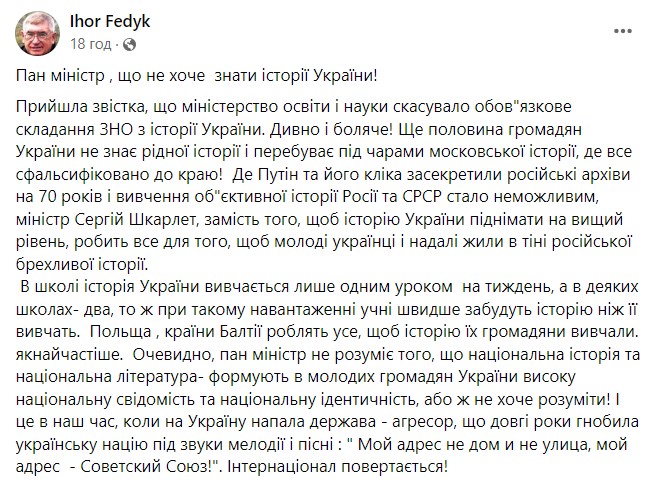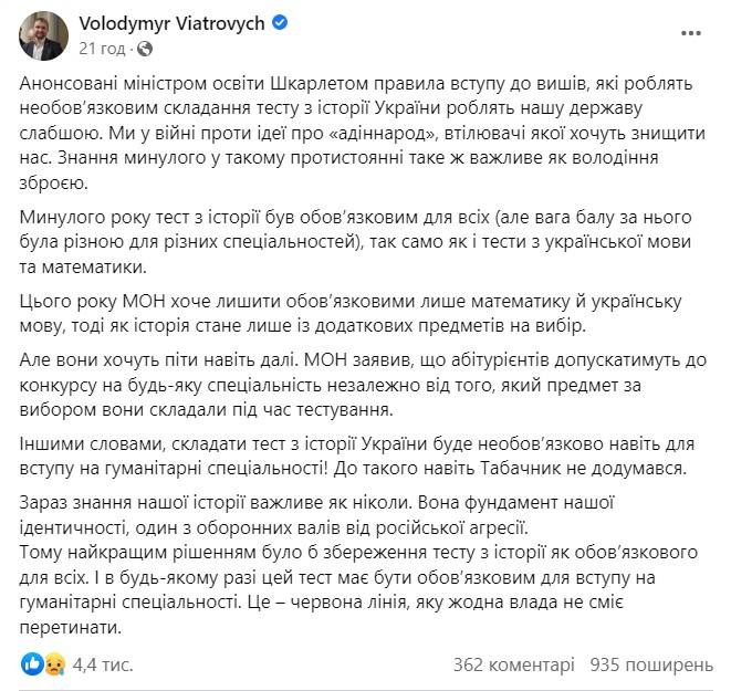 Нардеп от фракции "ЕС" Владимир Вятрович утверждает, что такая позиция Шкарлета делает страну более уязвимой в условиях полномасштабной войны. По словам парламентария, абитуриентам не нужно будет сдавать историю Украины даже при поступлении на гуманитарные специальности.