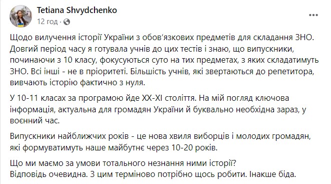 Кандидат исторических наук Татьяна Швыдченко отмечает, что выпускники ближайших лет, которых хотят освободить от сдачи истории Украины, являются новым поколением избирателей. На их плечи, по ее словам, ложится ответственность за формирование будущего страны на 10-20 лет, поэтому инициативу Минобразования необходимо пересматривать.