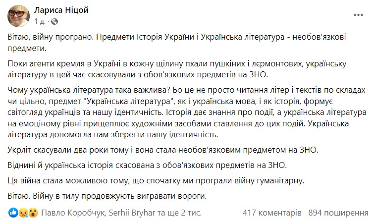 Украинская писательница Лариса Ницой утверждает, что наша страна из-за инициативы Минобразования проиграла войну. По ее словам, пока в школьную программу пытаются вернуть произведения Александра Пушкина и Михаила Лермонтова, ведомство отменяет обязательную сдачу тестов по украинской литературе.