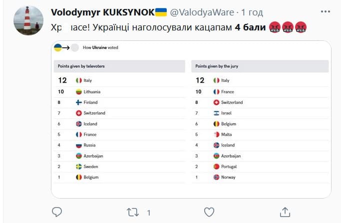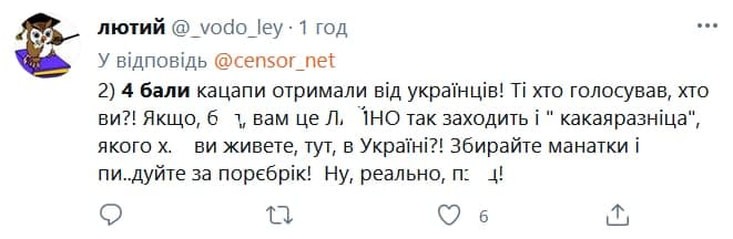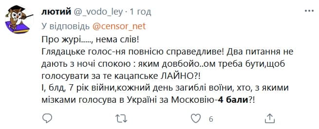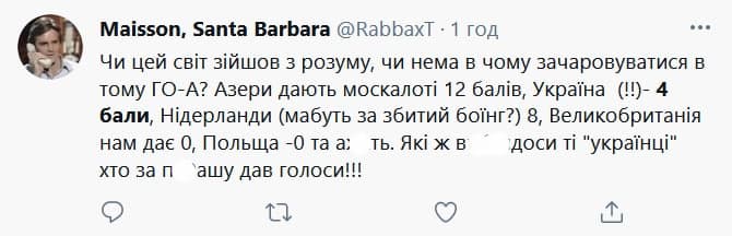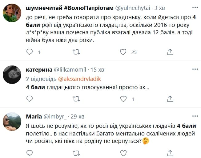 "4 балла зрительского голосования, просто как...", "Я что-то не понимаю, как России от украинских зрителей 4 балла полетело. У нас настолько много ментально покалеченных людей или россиян, которые никак на родину ре вернутся?", "Хр*насе, украинцы наголосовали россиянам 4 балла", "Про жури нет слов. Зрительское голосование полностью справедливое. Два вопроса не дают с ночи покоя: каким д***бом нужно быть, чтобы голосовать за российское г**но?.. 7 год войны, каждый день погибшие воины, кто и с какими мозгами голосовал в Украине за Московию?", "У нас полстраны за регионалов голосовало. Они никуда не делись, все рядом ходят", "4 балла за матрешку. Люди, что в ваших головах?", - эмоционально возмущались украинцы.
