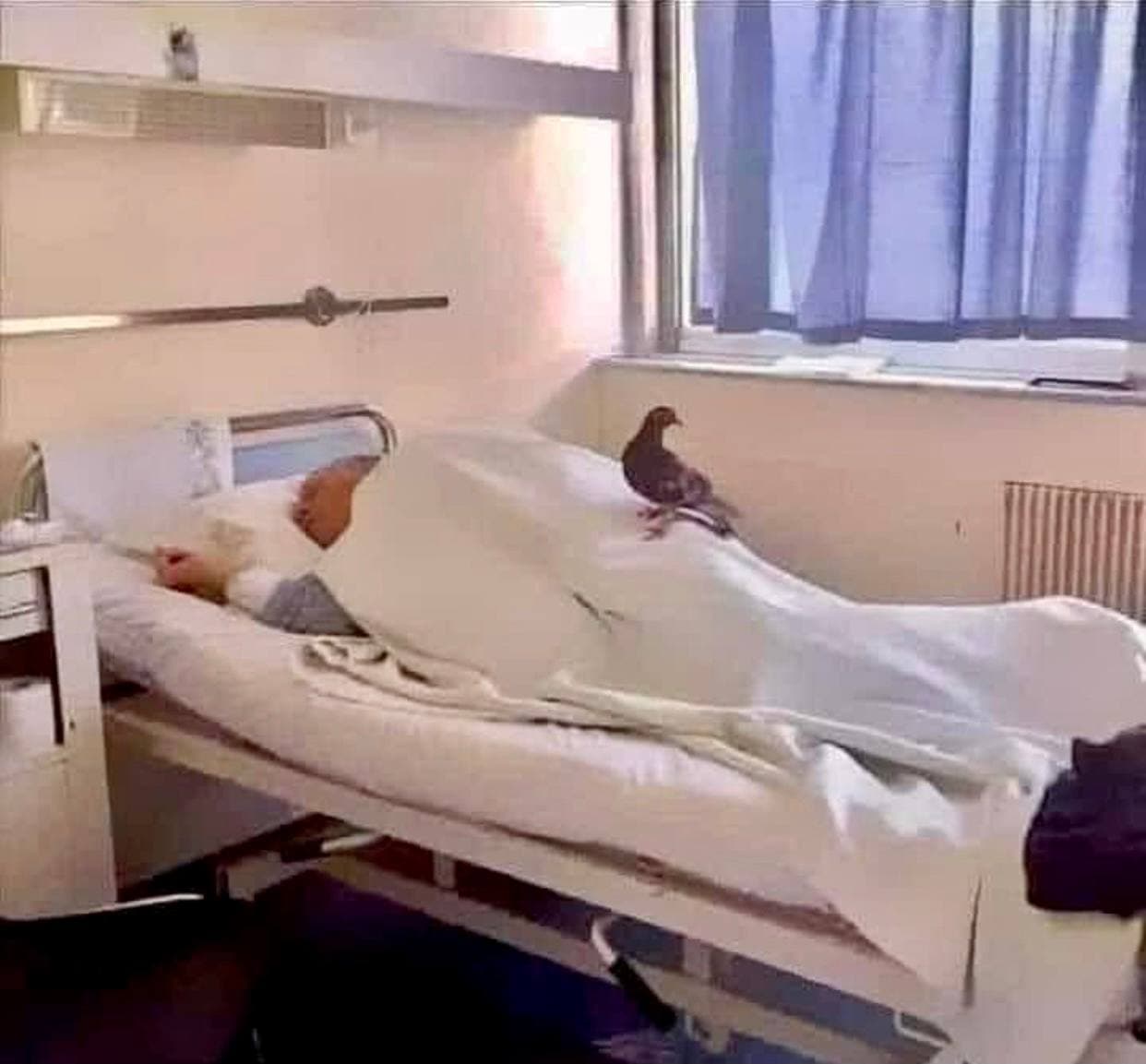 "Прошло 23 дня с тех пор, как этот пациент прибыл в больницу, и за эти 23 дня никто из его семьи не пришел спросить о его здоровье. Но голубь прилетает каждые 2 дня и садится на его постель. Птица остается на некоторое время, и затем кружит в небе", - прокомментировала снимок сотрудница больницы.