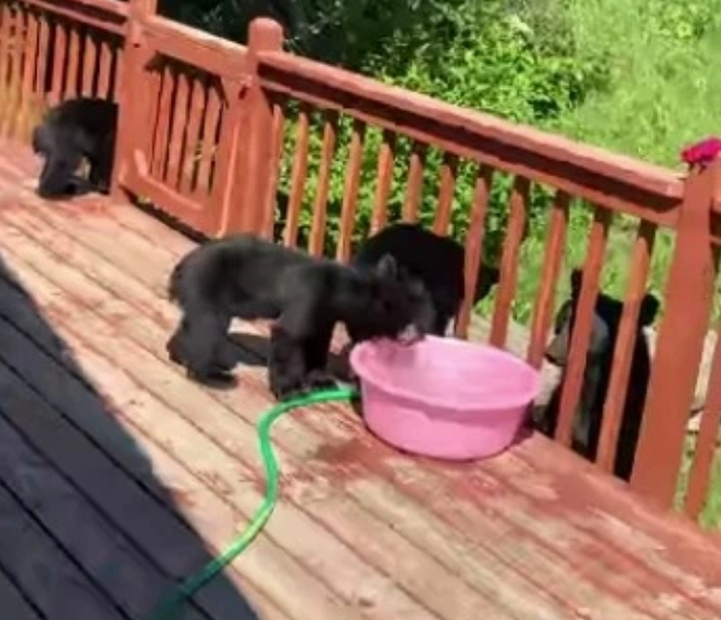 Шокирующее видео, снятое хозяйкой, показывает, как один медведь зависает на кухонной стойке над раковиной и ест, а два находятся на полу возле заднего входа.