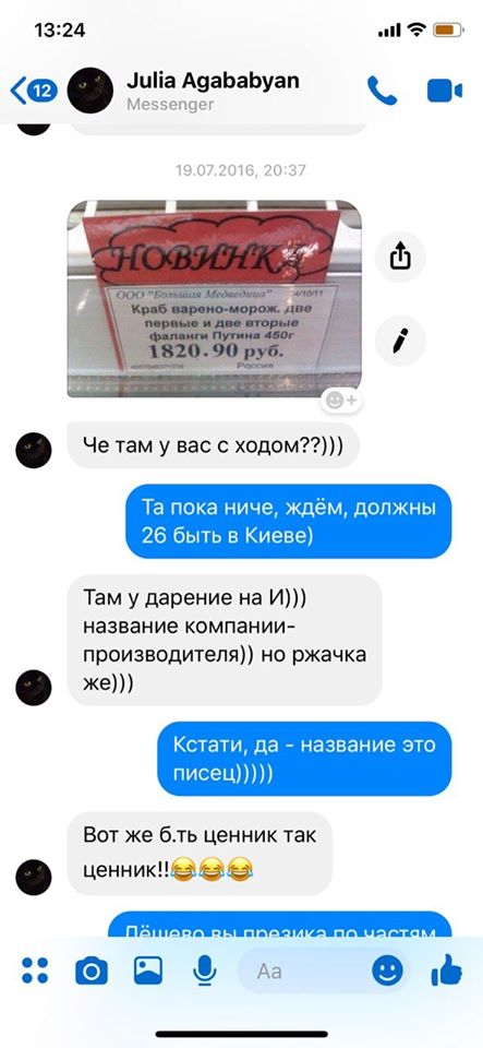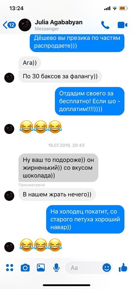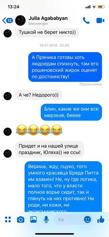 "Помните, как на пресс-конференции некий генерал с каменным лицом вещал о том, что телефон Юли 19.07.2016 года с 19-ти был неактивным, что для нее нехарактерно. Добавляю скрины с фейсбук месседжер Юли, где она переписывается со своей подругой с 20.37 до 20.50, 19.07.2016 года. Кстати, в мессенджере фейсбук невозможно изменить дату и время (это для неверующих)", - пишет Добош.