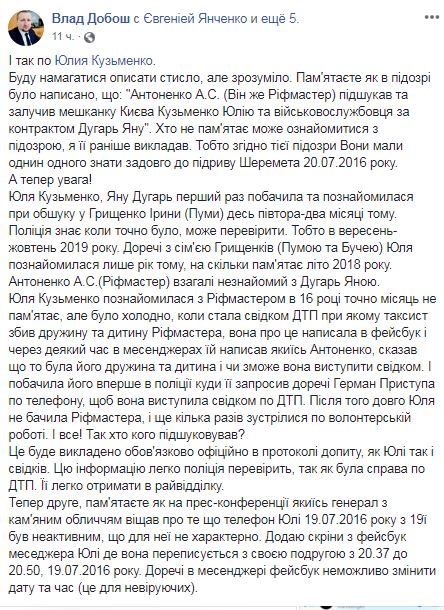 "Юля Кузьменко Яну Дугарь первый раз увидела и познакомилась при обыске у Грищенко Ирины (Пумы) где-то полтора-два месяца назад... Кстати, с семьей Грищенко (Пумой и Бучей) Юля познакомилась только год назад, насколько помнит, лето 2018 года. Антоненко А.С. (Рифмастер) вообще не знаком с Дугар Яной. Юля Кузьменко познакомилась с Рифмастером в 16 году, точно месяц не помнит, но было холодно, когда стала свидетелем ДТП, при котором таксист сбил жену и ребенка Рифмастера, она об этом написала в фейсбук, и через некоторое время в мессенджерах ей написал какой-то Антоненко, сказал, что это была его жена и ребенок и сможет ли она выступить свидетелем", - пишет он.