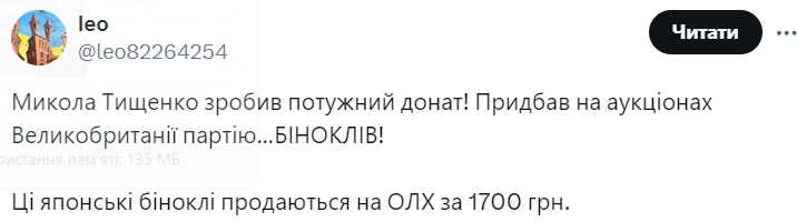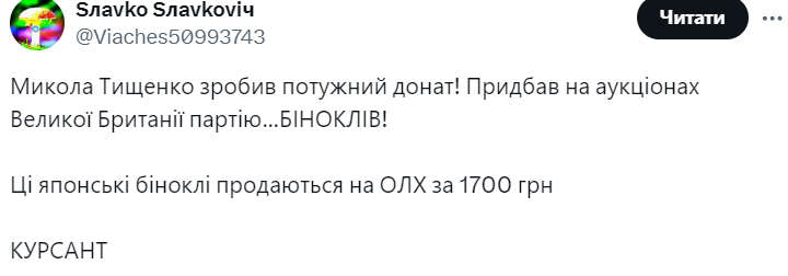В соцсети Х также среагировали на такой донат нардепа, заметив, что японские бинокли можно приобрести за 1700 грн на платформе онлайн-объявлений ОЛХ.