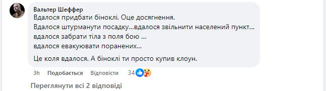 В комментариях к сообщению Тищенко Шеффер также указал: "Удалось приобрести бинокли. Вот это достижение. Удалось штурмануть посадку ... удалось освободить населенный пункт ... удалось забрать тела с поля боя ... удалось эвакуировать раненых ... Это коля удалось. А бинокли ты просто купил клоун".