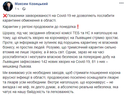 "Каждый раз, во время заседания областной комиссии ТЭБ и ЧС я подчеркиваю, что количество больных коронавирус на Львовщине стремительно растет. Однако, эта информация не останавливает от нарушений карантина ни владельцев бизнеса, ни простых людей. Понимаю, что трехмесячный карантин сильно утомил не только Украину, но и весь мир. Однако, сейчас не время расслабляться и пренебрегать собственной безопасностью", - пишет Козицкий.