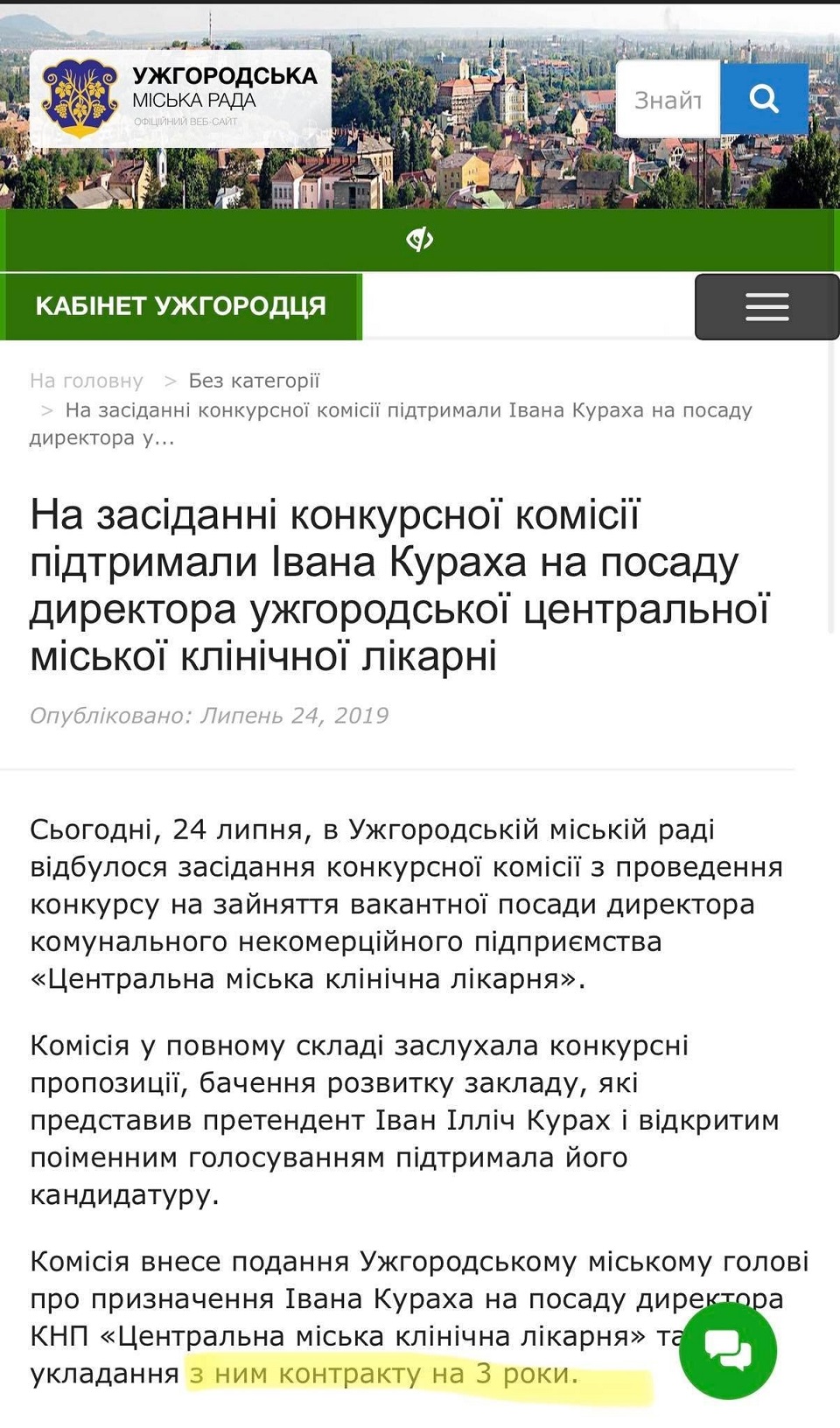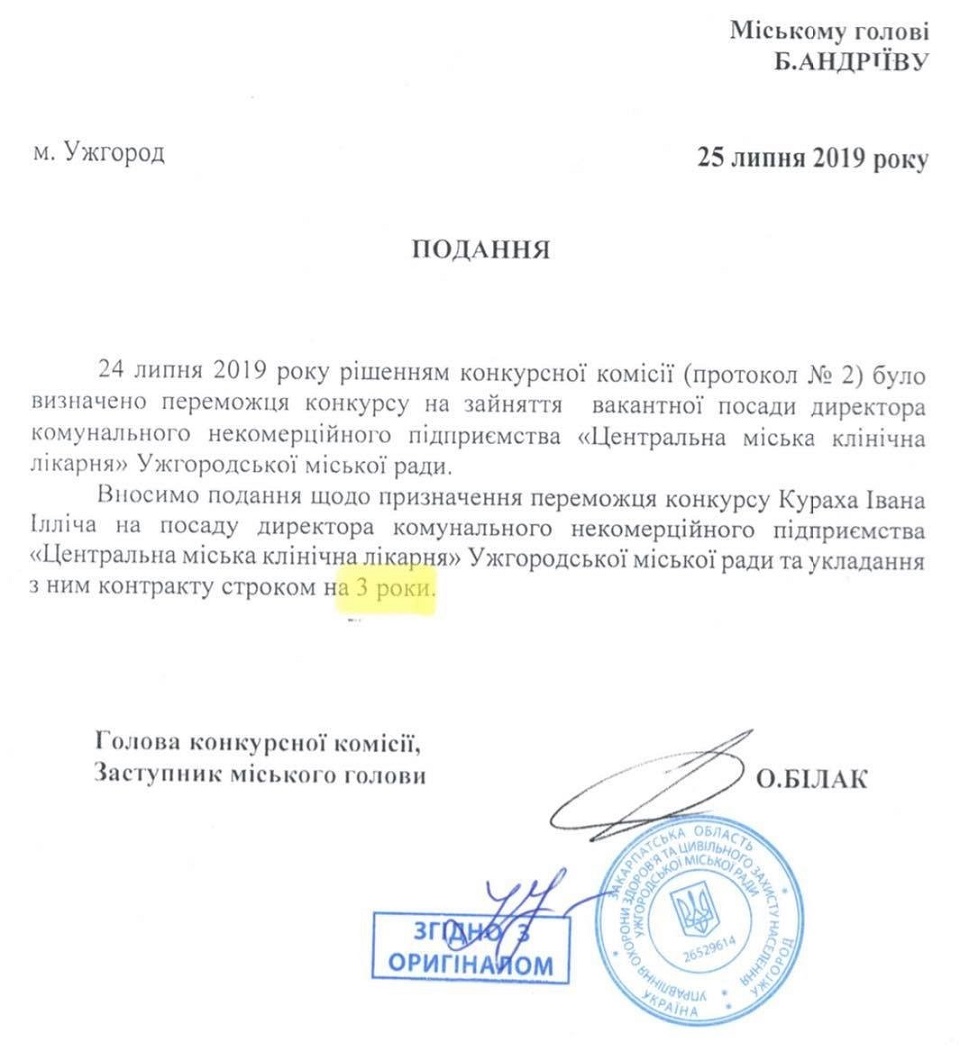 "После рассмотрения кандидатур на вакантную должность руководителя больницы конкурсная комиссия, которую возглавлял Александр Билак, приняла решение и избрала победителя конкурса Ивана Кураха. Следующий шаг – представление на имя городского головы Богдана Андреева о назначении сроком на 3 года Ивана Кураха на должность директора КНП "Ужгородская городская больница". Это представление с указанным сроком действия договора с победителем конкурса "3 года" было опубликовано на сайте Ужгородского городского совета", – объяснили журналисты, добавив, что дальнейшее развитие событий вызывает массу вопросов.