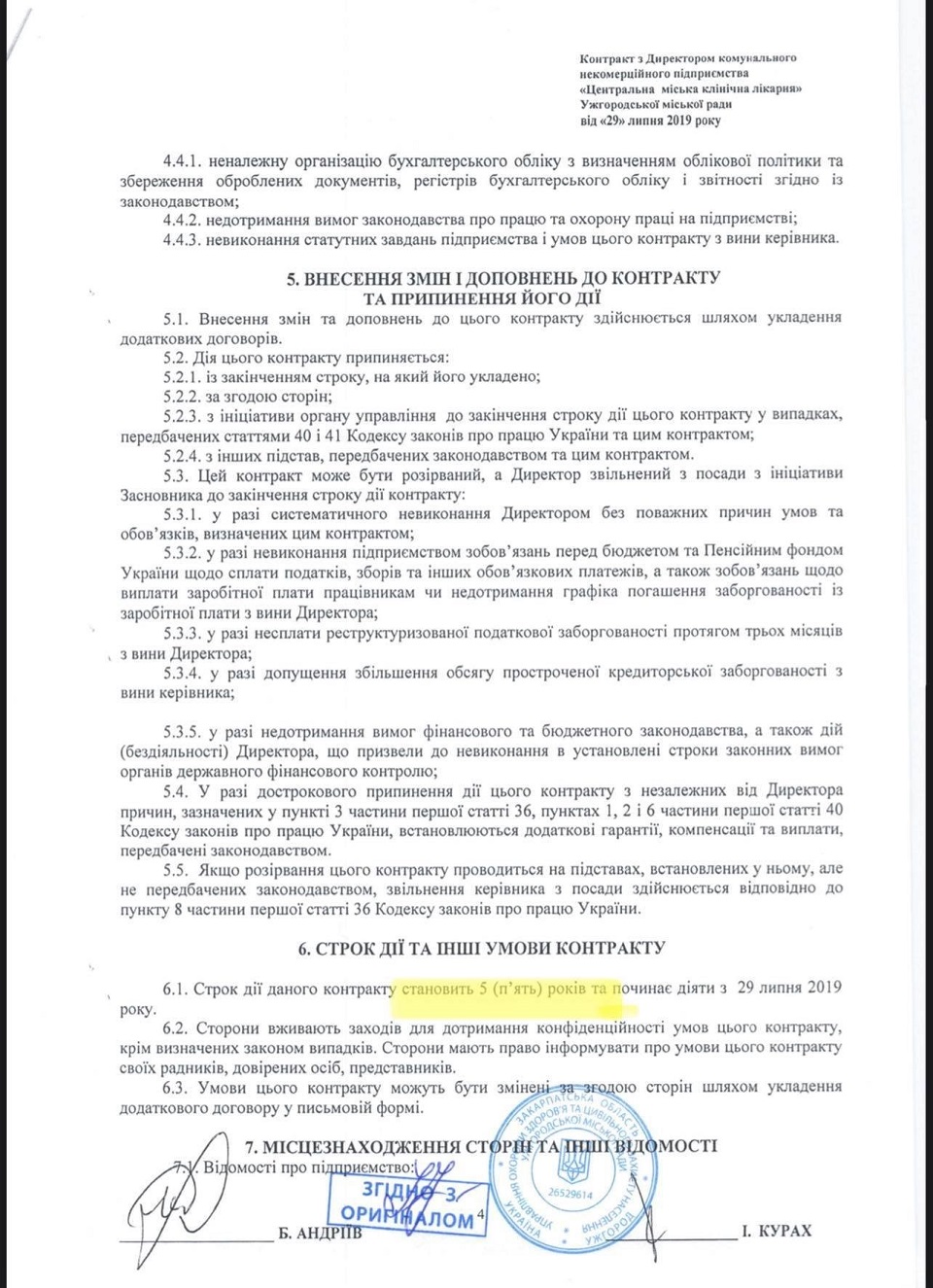 Так, 29 июля 2019 Андреев подписывает "Контракт с Директором коммунального некоммерческого предприятия "Центральная городская клиническая больница" Ужгородского городского совета.