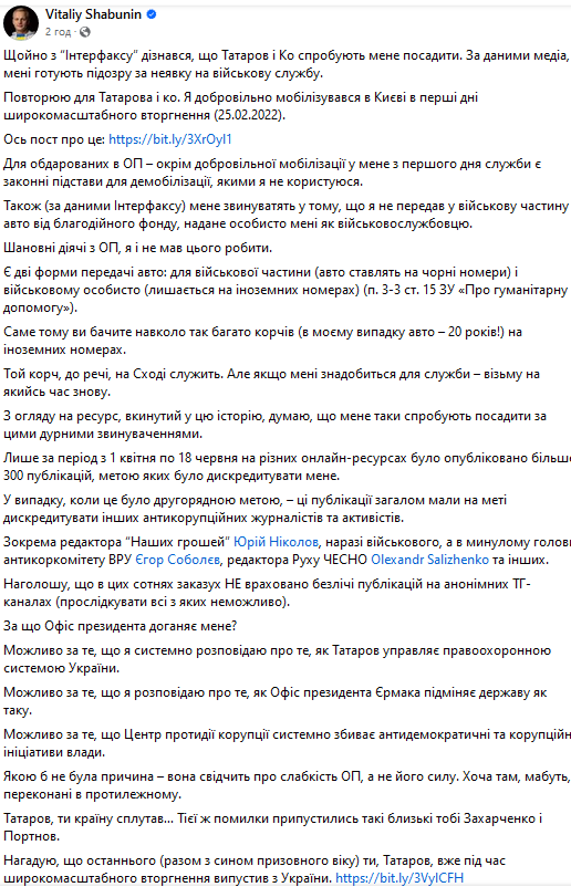"Только что из "Интерфакса" узнал, что Татаров и Ко попытаются меня посадить. По данным медиа, мне готовят подозрение за неявку на военную службу. Повторяю для Татарова и ко. Я добровольно мобилизовался в Киеве в первые дни широкомасштабного вторжения (25.02.2022)", – написал он.