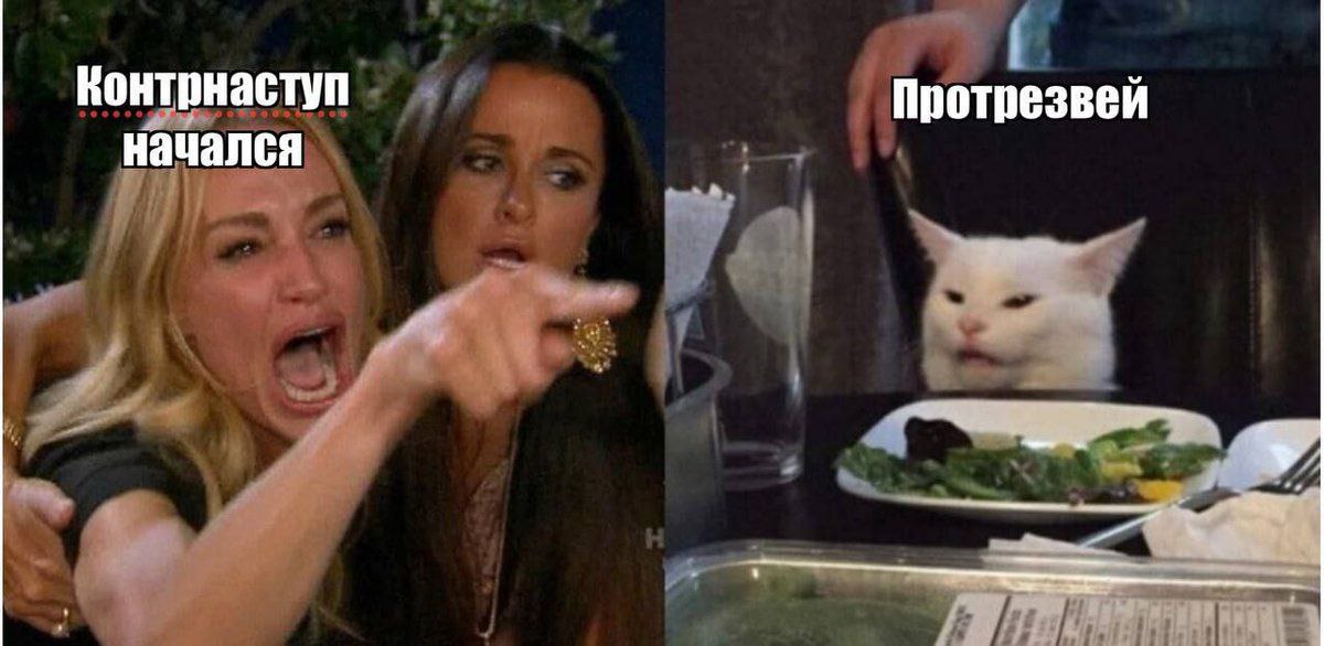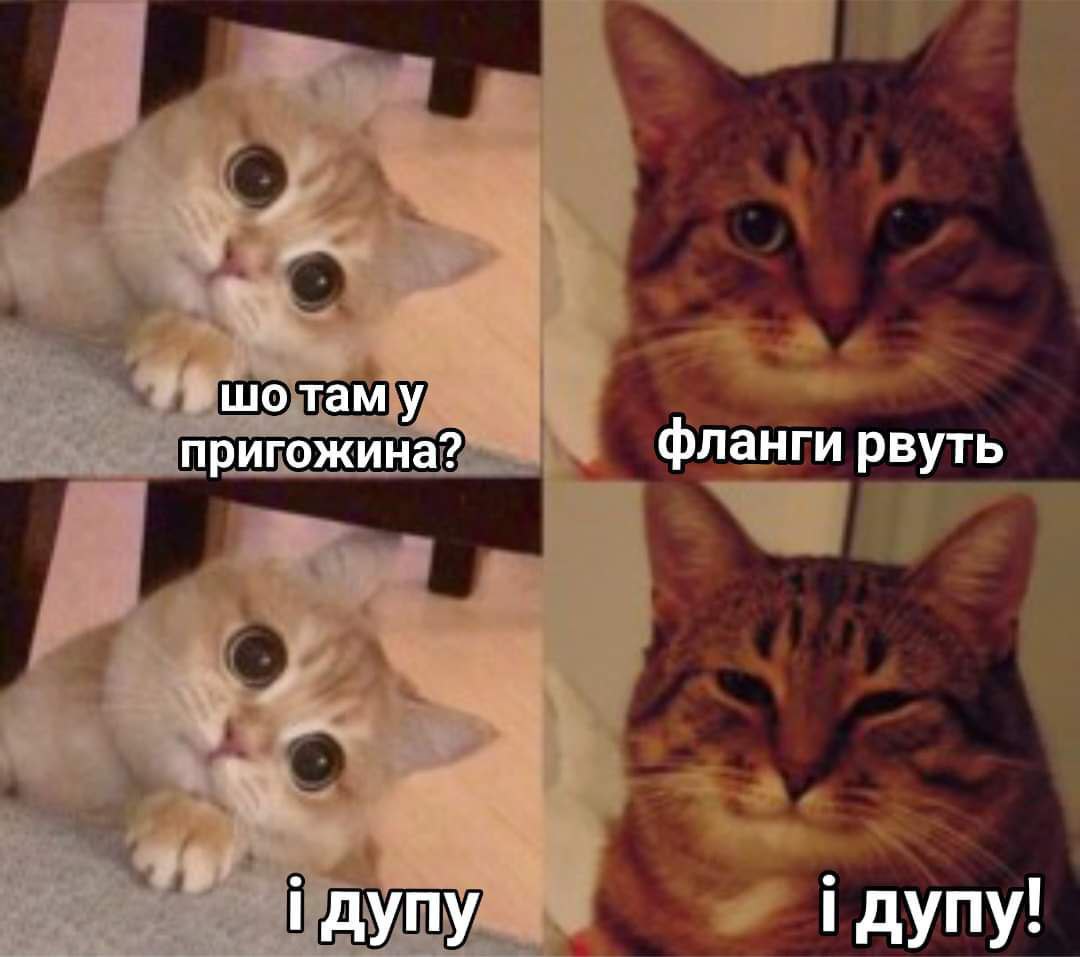 Контрнаступление ВСУ обсуждают даже котики. Один спрашивает: "Что там у Пригожина?" "Фланги рвут", – отвечает другой, добавляя, что не только их.