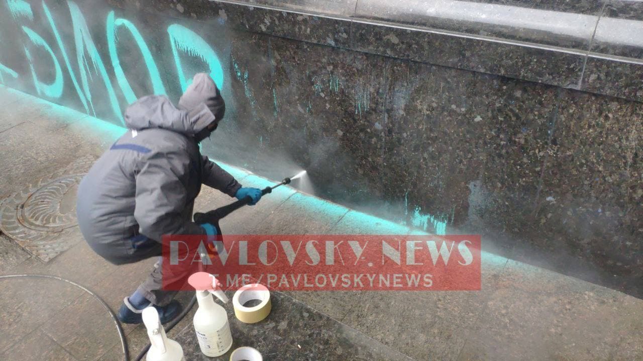 Как стало известно, хотя на протяжении дня удалось отмыть только шесть букв, в компании обещают, что процесс очистки стен займет не более двух дней. Чтобы краска смывалась, сегодня поверхность, на которой нанесены надписи, обрабатывали химическим раствором. После этого струя воды под напором смывала краску.
