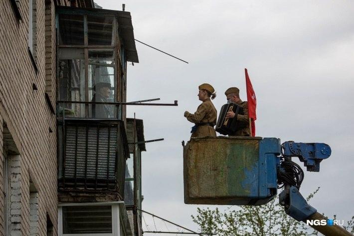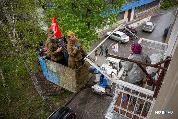 Так, в российском Новосибирске ветеранов Великой Отечественной Войны решили поздравить весьма необычным способом: при помощи подъемника люди в советской военной форме и флагом СССР поднимались к героям войны на балкон.