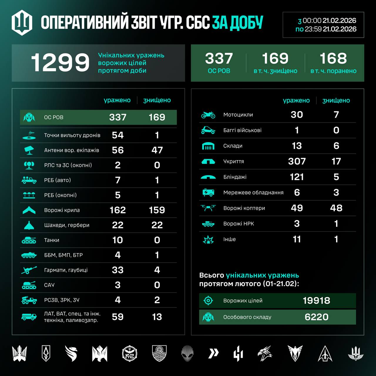 Всего за февраль (01–21.02) уничтожено/поражено 19918 целей, из них – 6220 личный состав противника.