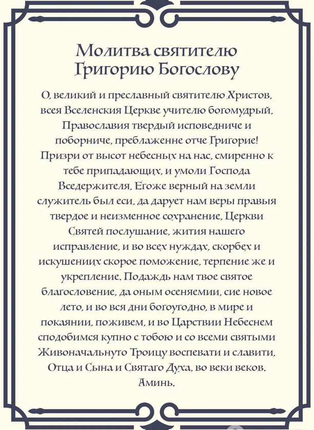 "О, великий и преславный святитель Христов, всей Вселенской Церкви учитель, богомудрый, православие крепкий проповедник и поборник, преблаженный отец Григорий.