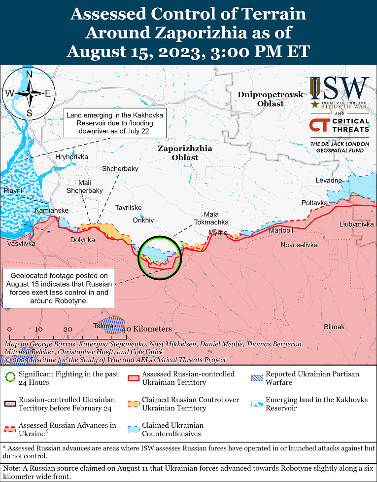 Вооруженным Силам Украины удалось продвинуться в Луганской области и в западной части Запорожской области. В частности, украинские силы продвинулись к югу от Дибровой, что в 7 км к юго-западу от Кременной, и к Роботиному на Запорожье.
