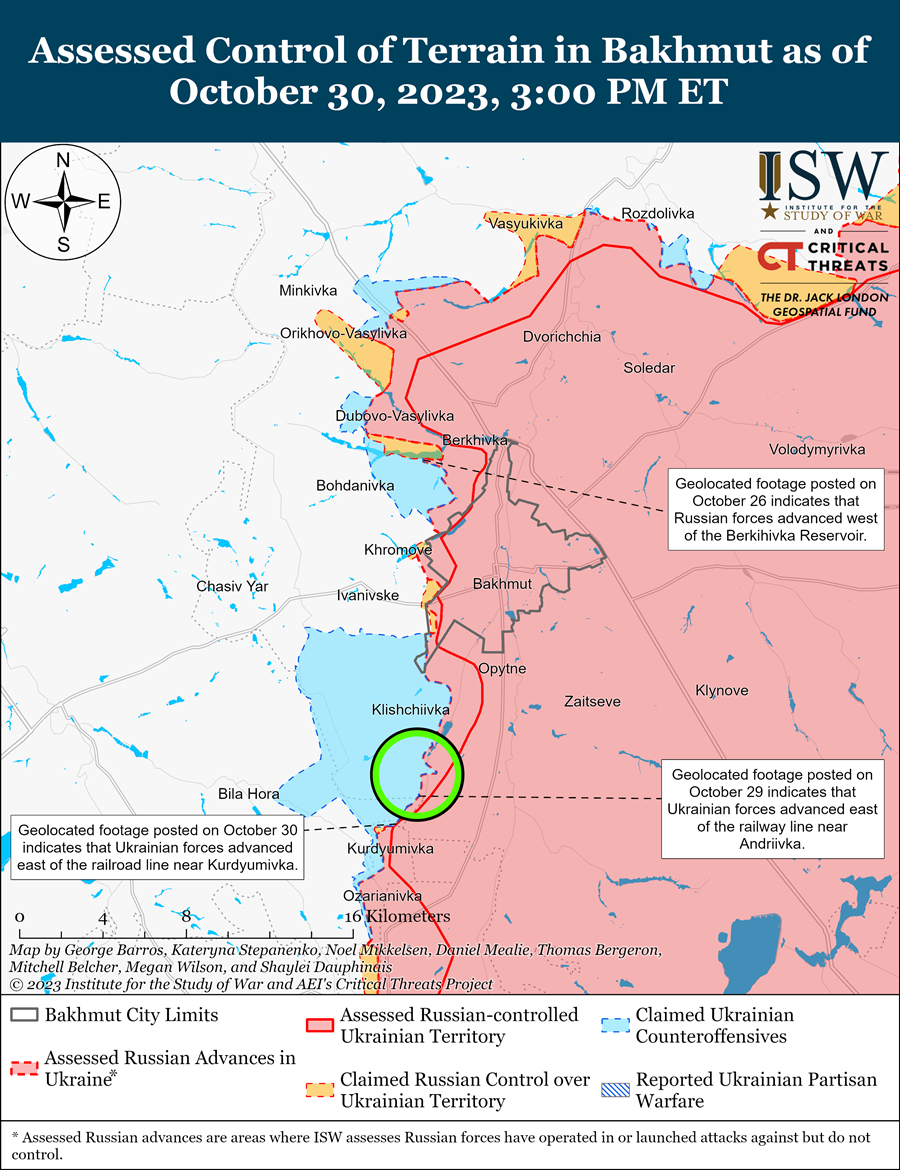 Геолокационные кадры, опубликованные 30 октября, показывают, что украинские силы продвигались к северо-востоку от Курдюмовки (10 км к юго-западу от Бахмута). Генштаб ВСУ заявил, что украинские войска продолжают наступательные действия к югу от Бахмута и наносят урон российским войскам в этом районе. Российский военкор утверждал, что украинским войскам удалось продвинуться за линию железной дороги к югу от Андреевки и закрепить новые позиции.