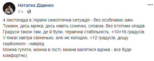 "4 ноября в Украине синоптическая ситуация - без особых изменений. Туманы, где морось, где-то даже солнышко, словом, без существенных осадков. Градусы также там, где и были, термическая стабильность: +10 +16 градусов. В Киеве завтра свеженькая, но не холодно, 12 градусов, дождя серьезного - вряд ли. Можно гулять, можно в гости, можно валяться дома - все будет комфортно)", - написала синоптик.