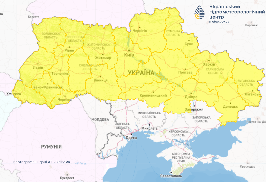 Для всей Украины, кроме Одесской, Николаевской, Херсонской, Запорожской областей и Крыма, объявили штормовое предупреждение и І уровень опасности (желтый), который свидетельствует о том, что погодные условия потенциально опасны.