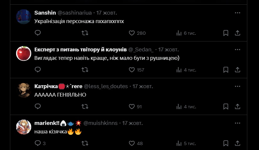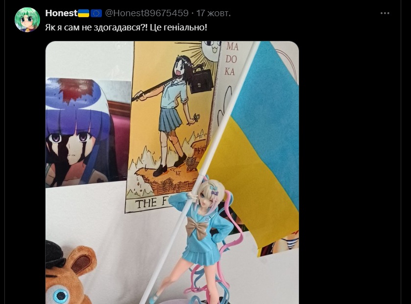 Так, девушка рассказала, что купила фигурку героини аниме, но она пришла без ружья. Ее отец забрал фигурку в свою комнату, а через некоторое время показал ей фото, где у фигурки вместо ружья в руках флаг Украины.