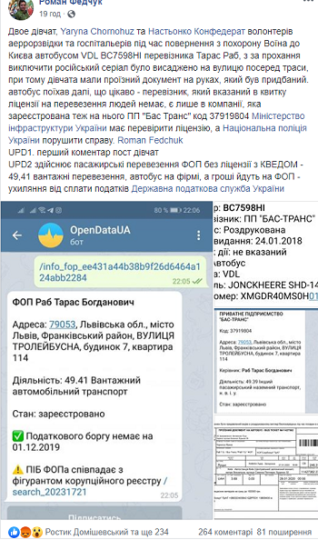 "Перевозчик, который указан в билете, лицензии на перевозку людей не имеет, она есть только в компании, зарегистрированной тоже на него - ЧП "Бас Транс"... Осуществляет пассажирские перевозки ФОП без лицензии с КВЭДом - 49,41 грузовые перевозки, автобус на фирме, а деньги идут на ФОП - уклонение от уплаты налогов", - резюмировал волонтер.