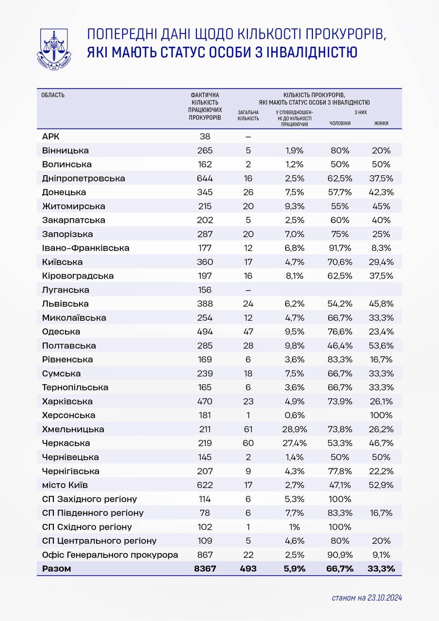 В самом Офисе Генерального прокурора насчитывается 22 прокурора со статусом лица с инвалидностью, то есть доля составляет 2,5% от общей массы в центральном аппарате.