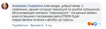 "К сожалению, данная ситуация произошла по ошибке сотрудников обслуживающей компании "Аэрохендлинг". На данный момент, всем оставшимся пассажирам рейса PS055 будет предоставлено питание и автобус до Одессы", - отметила представитель МАУ.