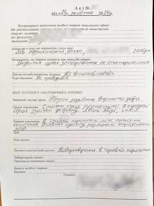 В полиции Ровенской области сообщили, что по факту обнаруженного тела льва на территории Костопольского завода завершили проверку. Согласно акту ветеринарного удостоверения гибели африканского льва, животное умерло в результате новообразования в брюшной полости.