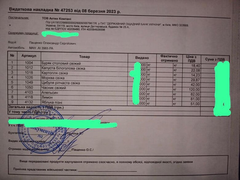 Военный, принимавший продукты, просмотрел накладную и отказался брать товар, написав рапорт, поскольку знал, что хозяйства продают яблоки за 10 гривен за килограмм. В то же время в магазинах яблоки можно найти по цене от 17 до 28 гривен.