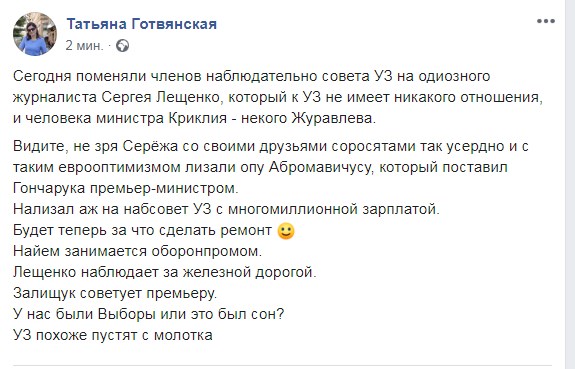"Сегодня поменяли членов наблюдательно совета "УЗ" Даниэля Билака и Константина Марьевича на одиозного журналиста Сергея Лещенко, который к УЗ не имеет никакого отношения, и человека министра (инфраструктуры, Владислава, - прим.ред.) Криклия – на некого Журавлева", - написал он.