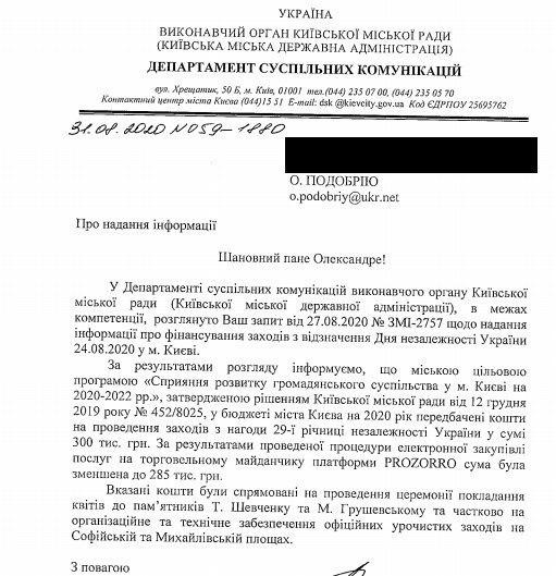 "По результатам рассмотрения сообщаем, что городской целевой программой "Содействие развитию гражданского общества в Киеве на 2020-2022 гг.", утвержденной решением Киевского городского совета от 12 декабря 2019 года №452/8025, в бюджете города Киева на 2020 год предусмотрены средства на проведение мероприятий по случаю 29-й годовщины независимости Украины в сумме 300 тыс. грн. по результатам проведенной процедуры электронной закупки услуг на торговой площадке платформы Prozorro сумма была уменьшена до 285 тыс", - говорится в документе.