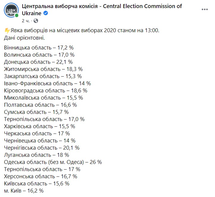 В ЦВК, также, обнародовали данные о явке избирателей по областям, по состоянию на 13:00 больше всего людей пришли на выборы в Одесской и Донецкой областях, а меньше всего в Ивано-Франковской и Черниговской.