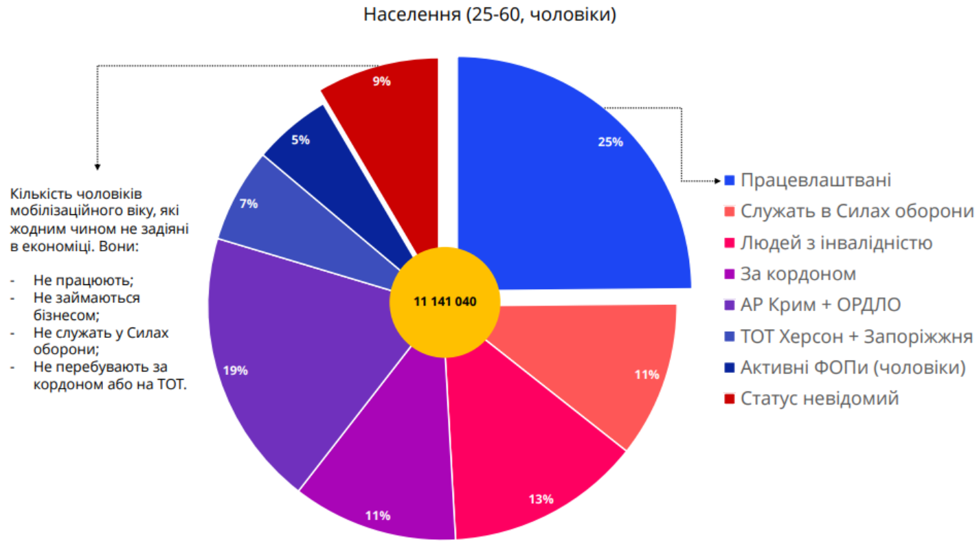 Поэтому реальной мобилизации подвергаются только две категории мужчин – это ориентировочно 4,5 млн украинцев. Первая – около 2,8 млн официально трудоустроенных мужчин и почти 0,6 миллиона активных предпринимателей. Вторая – мужчины, находящиеся в тени. Их насчитывается около 950 тысяч.