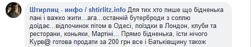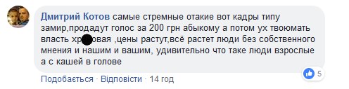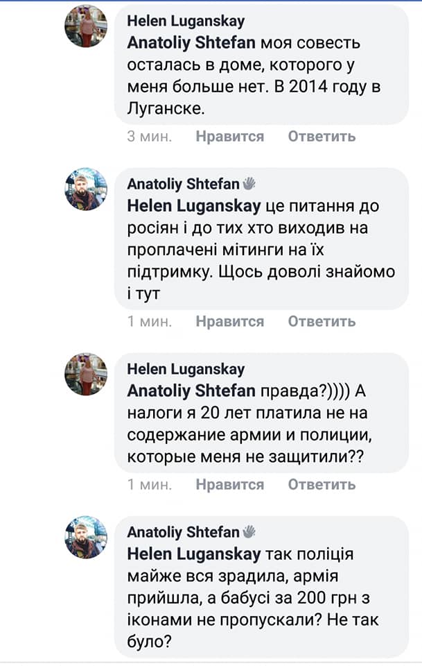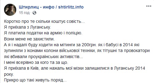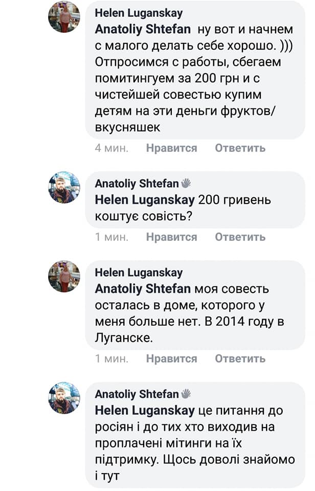 "Коротко о том, сколько стоит совесть ... Я приехала из Луганска. Я платила налоги на армию и полицию. Они меня не защитили. А я и в дальнейшем буду ходить на митинги за 200грн. Как и бабушки в 2014 году, которые останавливали с иконами колонны военной техники, как титушня и провокаторы, которые убивали проукраинских активистов ... И мне все равно, за кого и за что. Я приехала в Киев, но, к сожалению, мои мозги остались в Луганске 2014 года. Обидно, что такие живут рядом", - иронично написал Штефан.