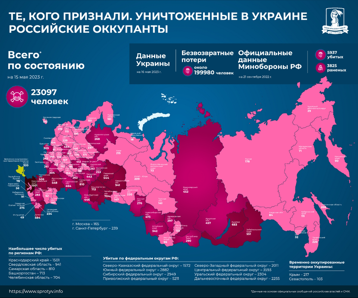 Хотя в Украине количество погибших оккупантов уже перевалило за 200 тысяч, по состоянию на 15 мая в самой стране-агрессоре зафиксировано только 23 097 человек, которые признаны мертвыми.