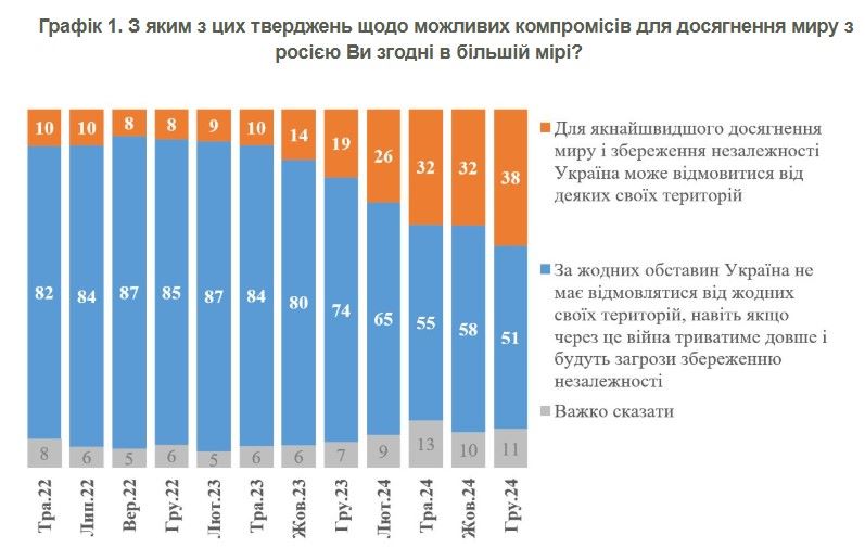 В конце 2024 года выросло количество украинцев, готовых к территориальным уступкам ради мира. Вместе с тем снизилась доля тех, кто категорически против любых уступок.