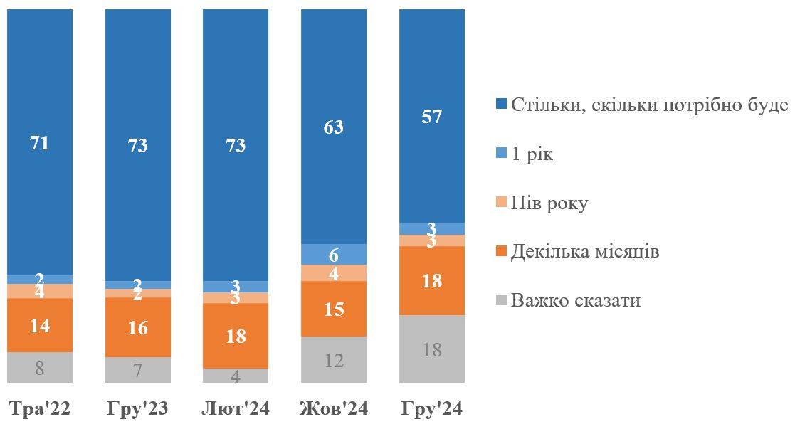 57% украинцев готовы терпеть войну столько, сколько потребуется (до февраля 2024 года так отвечали 71-73% опрошенных, между февралем и октябрем – 63%). 3% опрошенных ответили, что готовы терпеть войну в течение года, 3% – полгода, 18% – несколько месяцев. 18% затрудняются с ответом.