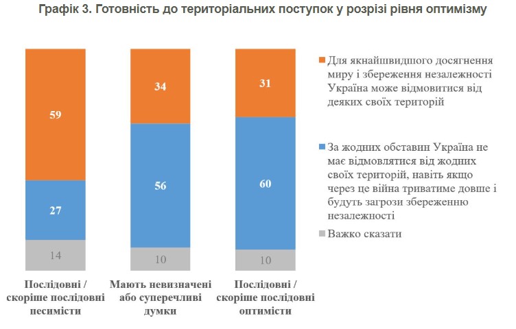 Еще один график показывает, что примерно 50% украинцев можно отнести к последовательным или скорее последовательным оптимистам, а 23% - к последовательным или скорее последовательным пессимистам. Среди пессимистов 59% считают, что следует идти на определенные территориальные уступки, категорически против – 27%. Среди оптимистов ситуация зеркально противоположная – 60% выступают категорически против никаких уступок, а 31% в целом готовы к определенным уступкам.