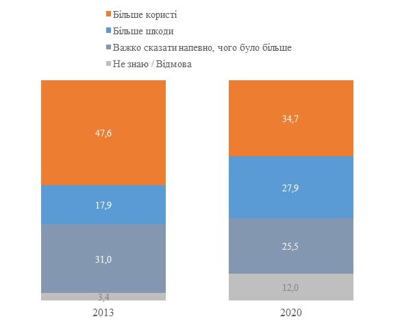 Однако тех, кто видит больше вреда, стало больше с 18% до 28%, а тех, кто "не может оценить, чего было больше", стало меньше с 31% до 25,5%.