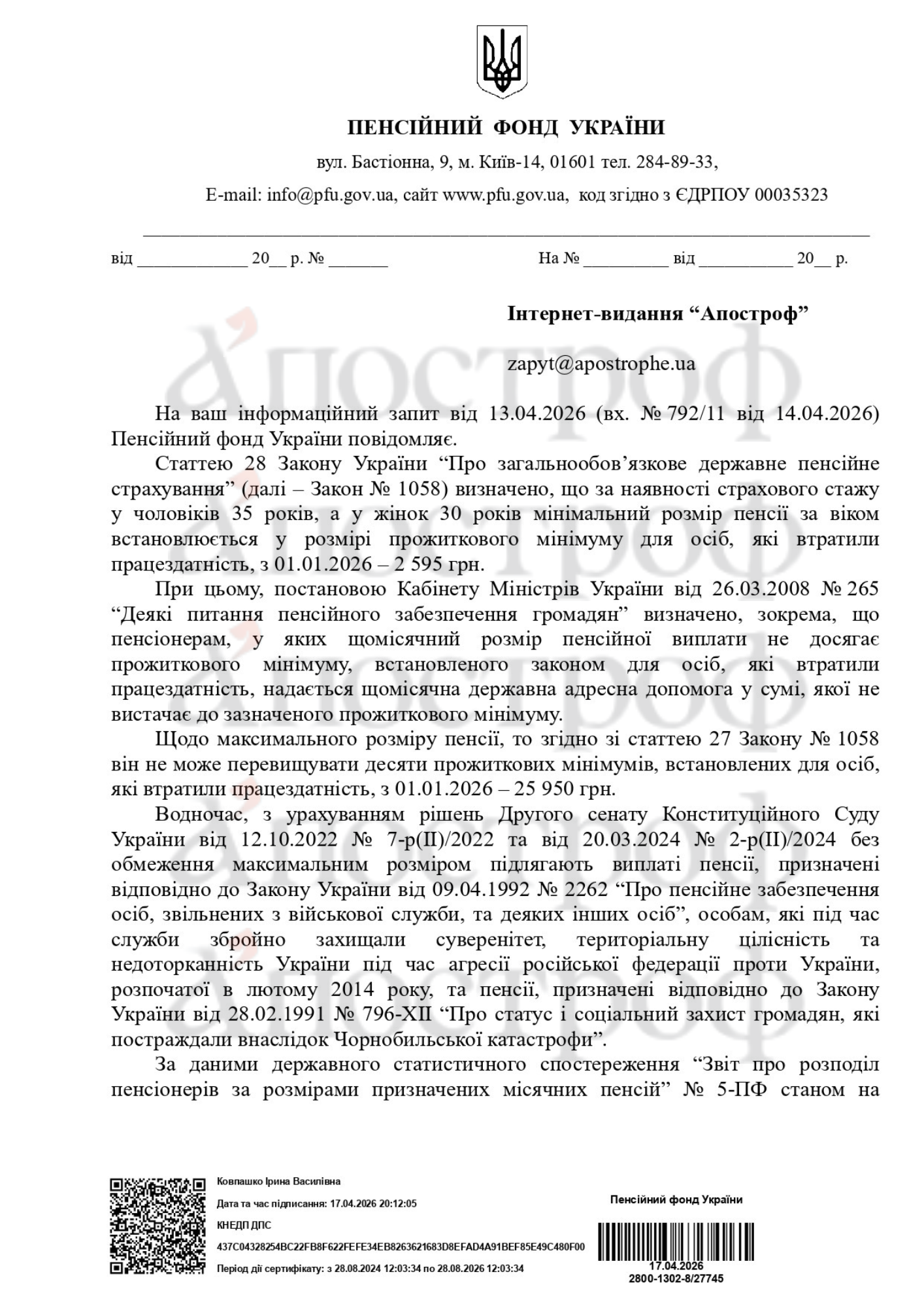 Об этом говорится в ответе Пенсионного фонда Украины (ПФУ) на официальный запрос "Апострофа".