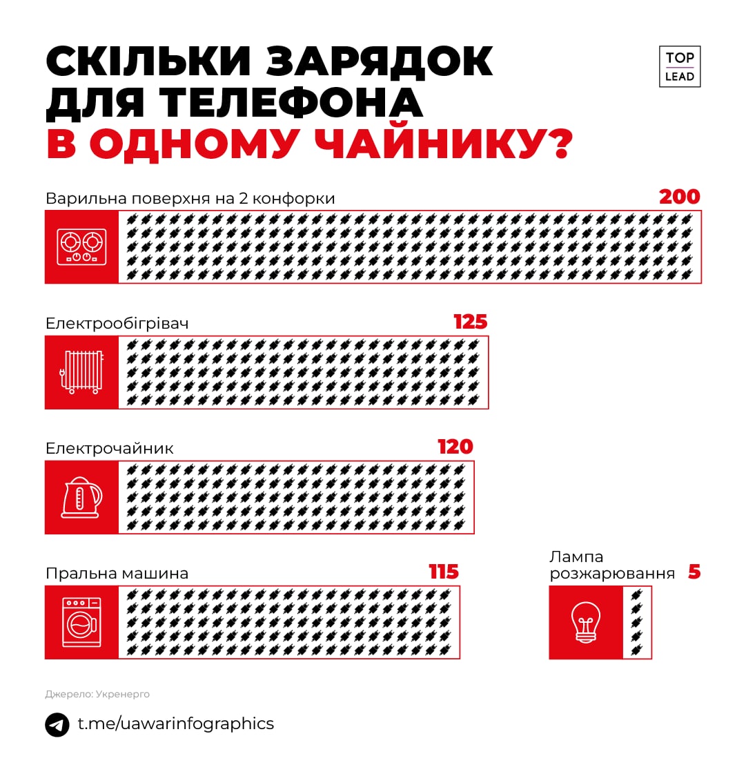 Канал UA War Infographics на примере зарядок для смартфона опубликовал сравнительный анализ того, какие приборы потребляют больше всего электроэнергии.