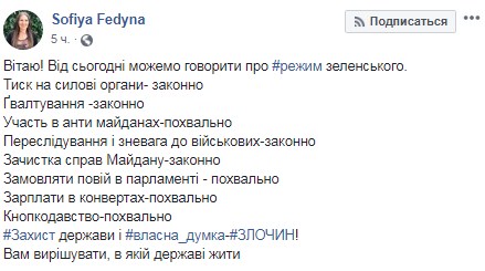 "Давление на силовые органы - законно. Изнасилования - законно. Участие в антимайданах -похвально. Преследование и пренебрежение к военным - законно. Зачистка дел Майдана -законно. Заказывать проституток в парламенте - похвально. Зарплаты в конвертах - похвально. Кнопкодавство - похвально. Защита государства и собственное мнение - преступление", - отметила депутат.