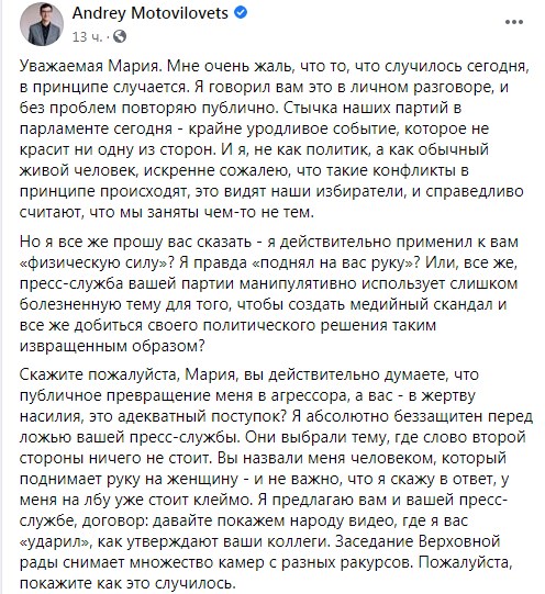 От Мотовиловца потребовали принести извинения за применение физической силы в Верховной Раде по отношению к Марии Ионовой. Также требуют вынести на рассмотрения регламентного комитета ВР вопрос об отстранении депутата от участия в заседаниях на 2-3 недели.