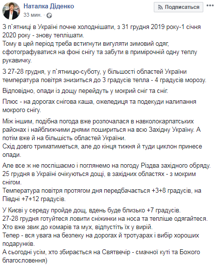 При этом, с 27-28 декабря, в пятницу и субботу, в большинстве областей Украины пройдет похолодание. Температура воздуха понизится до 3 градусов тепла – 4 градусов мороза.